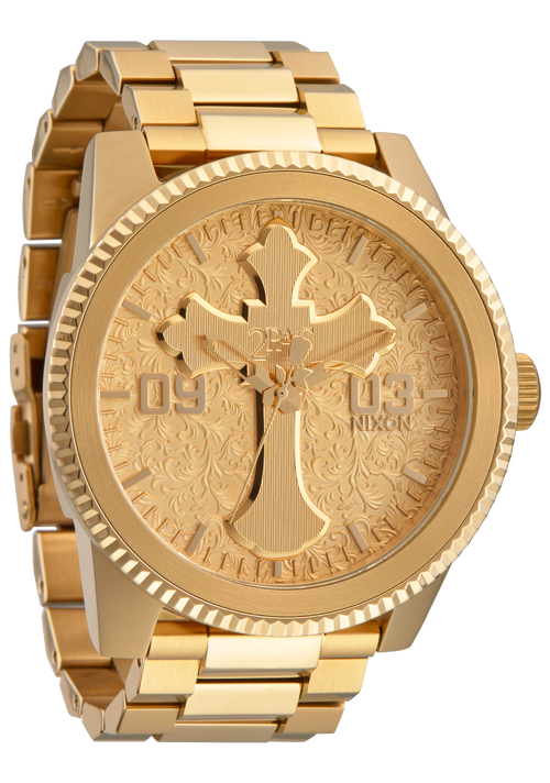 The 2PAC Corporal watch reflects boldness and ambition, with a striking design and a two-tone gold on gold band that commands attention. Emblazoned with signature iconography and custom etched bezel this watch symbolizes a commitment to authenticity and staying true to oneself.