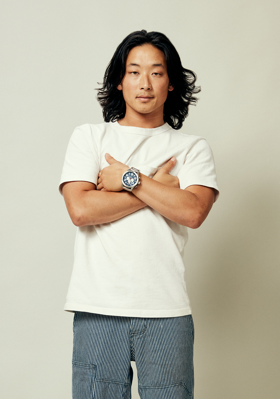 The crown and pushers are located on the 9 o'clock side of the case instead of 3 o'clock to prevent "wrist bite" during active use. Six-hand chronograph with 24-hour and second timer subdials.