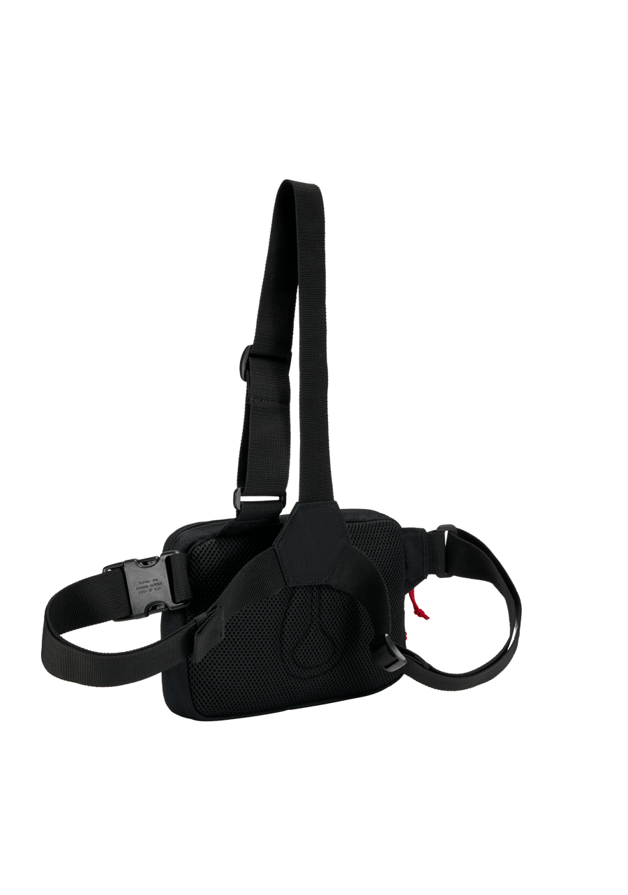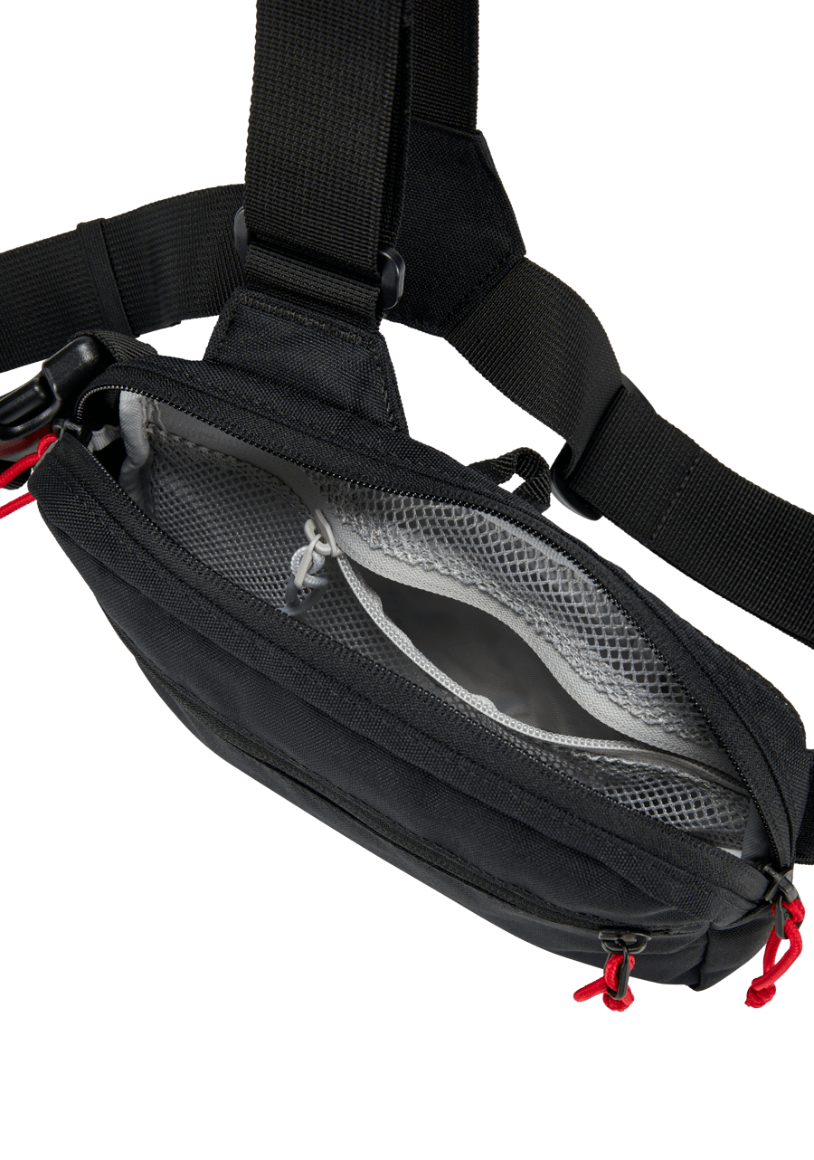 Breathable mesh back panel facilitates airflow and cuts down on sweat. Front-facing harness design adds style to the functionality and security of the Bandit. Internal and external zippered pockets and internal organizers like a key clip and slip pockets.