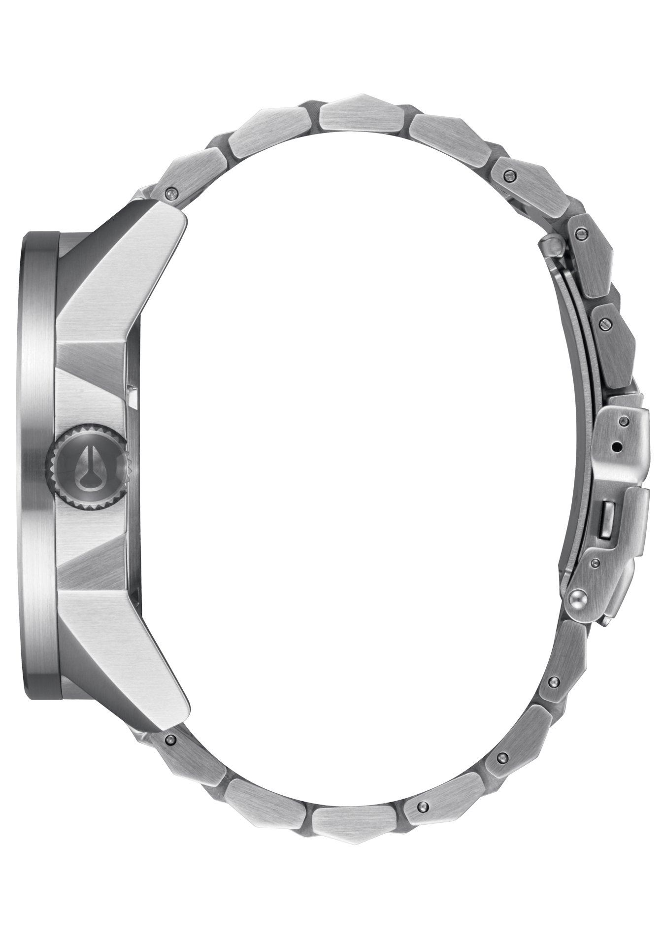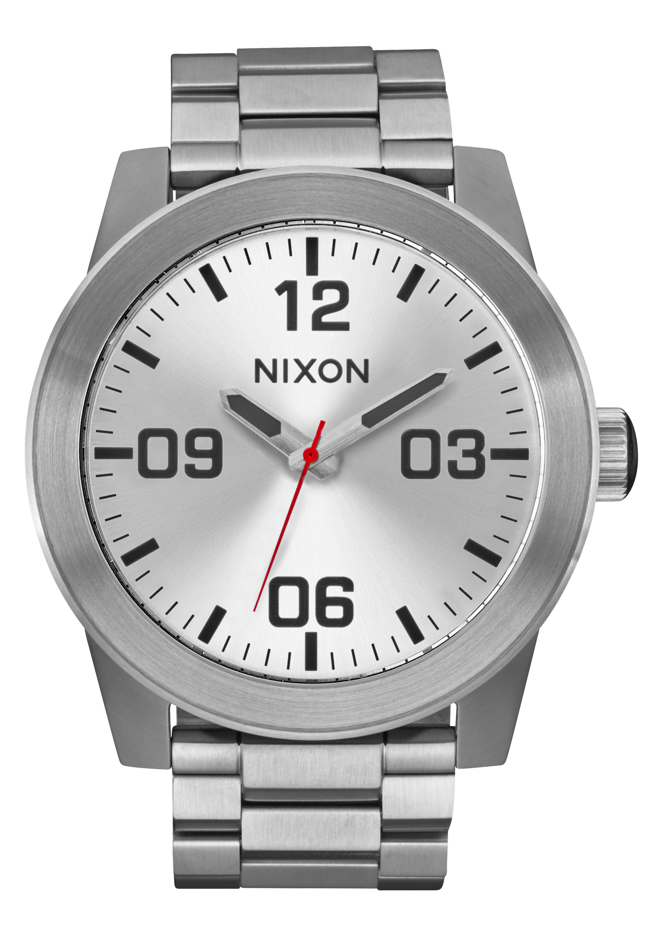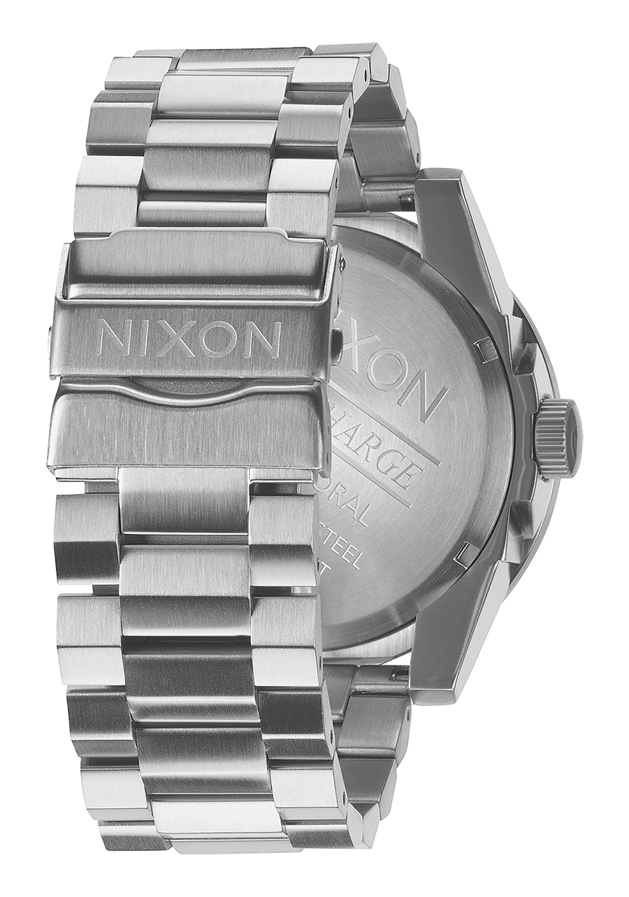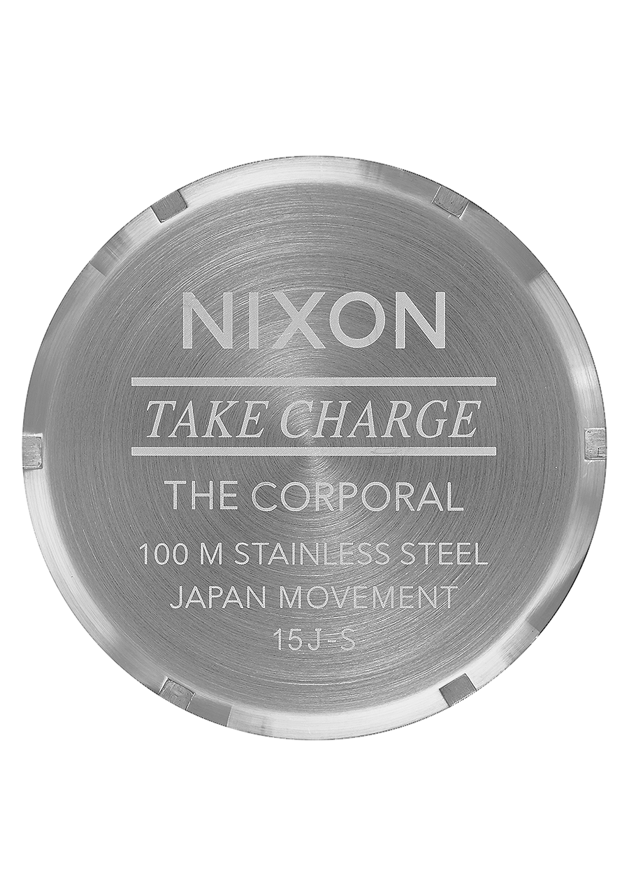 The Nixon Corporal features a 48mm custom solid stainless steel case, a solid stainless steel fixed bezel, and a hardened mineral crystal.