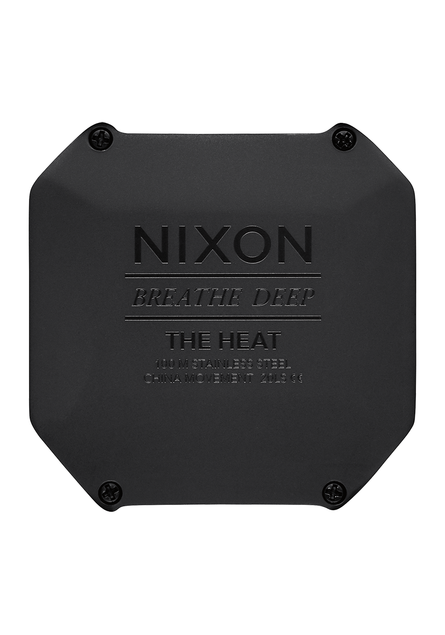 The Nixon Heat features a 38mm custom ultra-thin 8mm stainless steel case with stainless steel pushers and a hardened mineral crystal for protection. The band is a 20mm injection molded rubber strap with a perforated design, engineered for durability, breathability, and comfort. The watch is designed for maximum performance in sports, offering robust protection against impacts and water resistance up to 100 meters / 10 ATM.