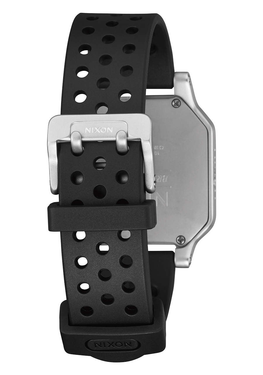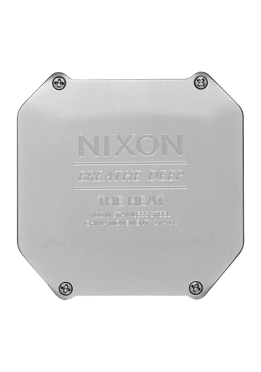 The Nixon Heat features a 38mm custom ultra-thin 8mm stainless steel case with stainless steel pushers and a hardened mineral crystal for protection. The band is a 20mm injection molded rubber strap with a perforated design, engineered for durability, breathability, and comfort. The watch is designed for maximum performance in sports, offering robust protection against impacts and water resistance up to 100 meters / 10 ATM.