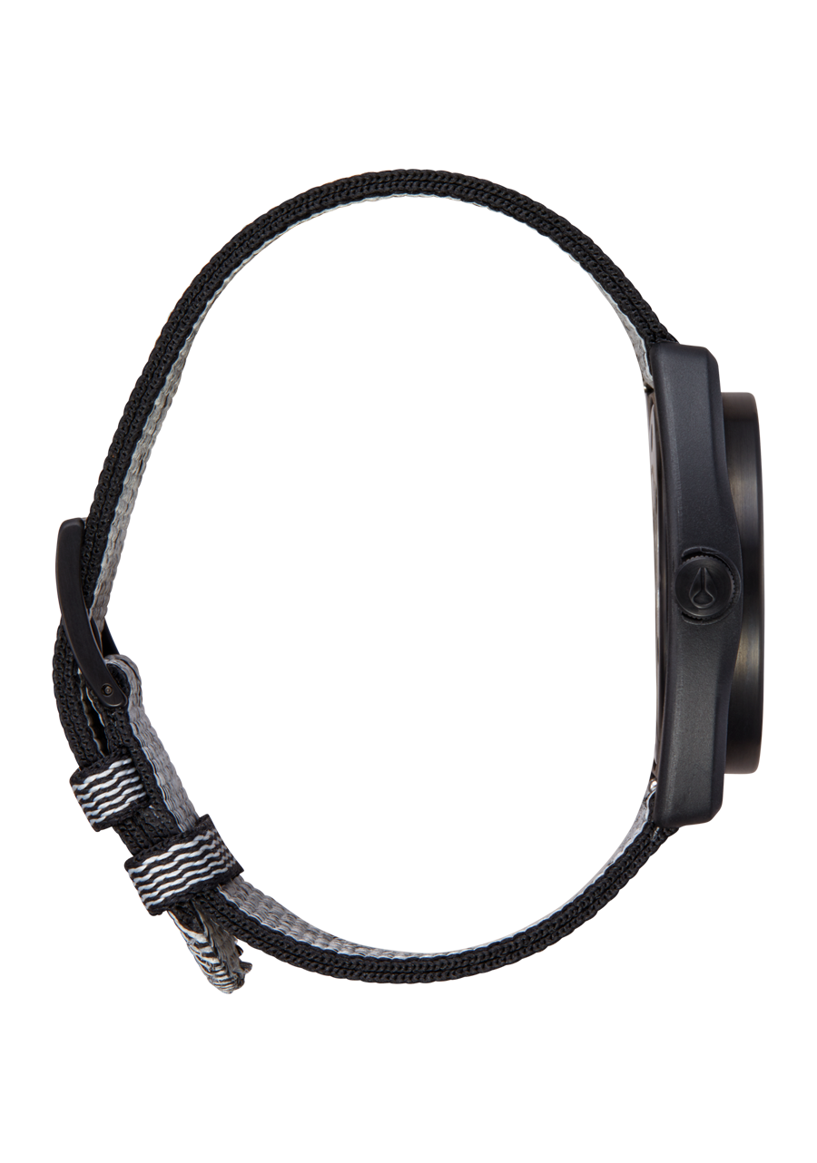 The Nixon Light-Wave watch features a 36mm case diameter made from recycled ocean plastic, with a stainless steel caseback. It includes a 20mm custom recycled ocean plastic woven strap. The dial showcases a semi-transparent dial and a unique design that highlights the solar panel within the watch face.