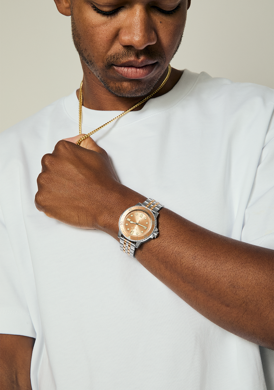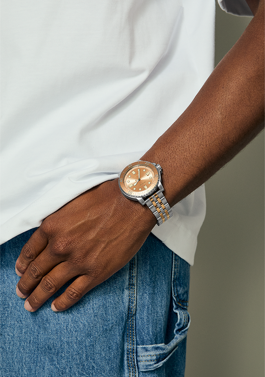 Dial is surrounded by a custom dial ring with a printed seconds track, bold applied indices and custom molded hands. Lume is applied to the indices and watch hands.