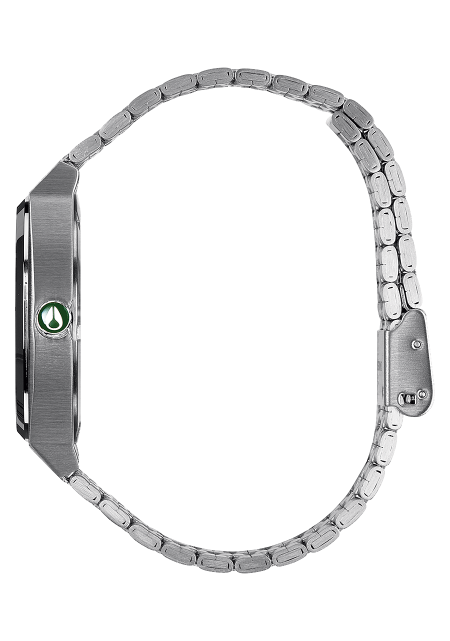 20-18mm tapered custom 5-link stainless steel bracelet and an adjustable stainless steel locking clasp.