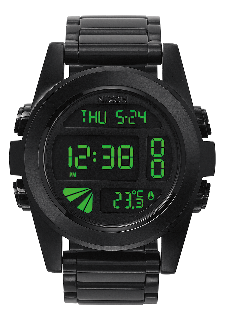 Custom digital movement with negative display, 12 or 24 hour time of day, calendar, temperature gauge, dual time, countdown timer, chronograph, alarm, and light functions.
